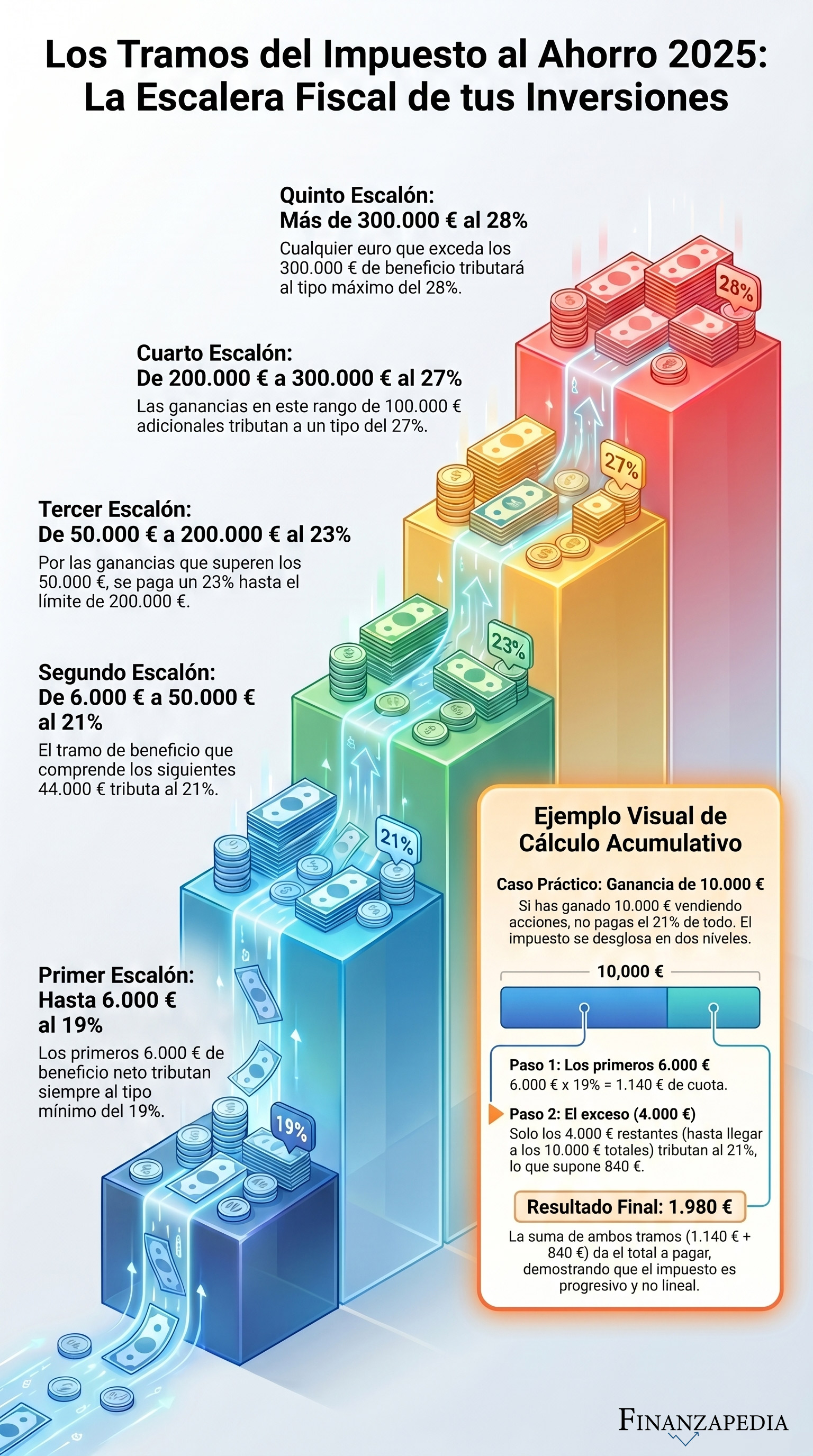 Ejemplo: Si has ganado 10.000 € vendiendo acciones, pagarás el 19% por los primeros 6.000 € (= 1.140 €) y el 21% por los 4.000 € restantes (= 840 €). Total: 1.980 €, no el 21% de todo.