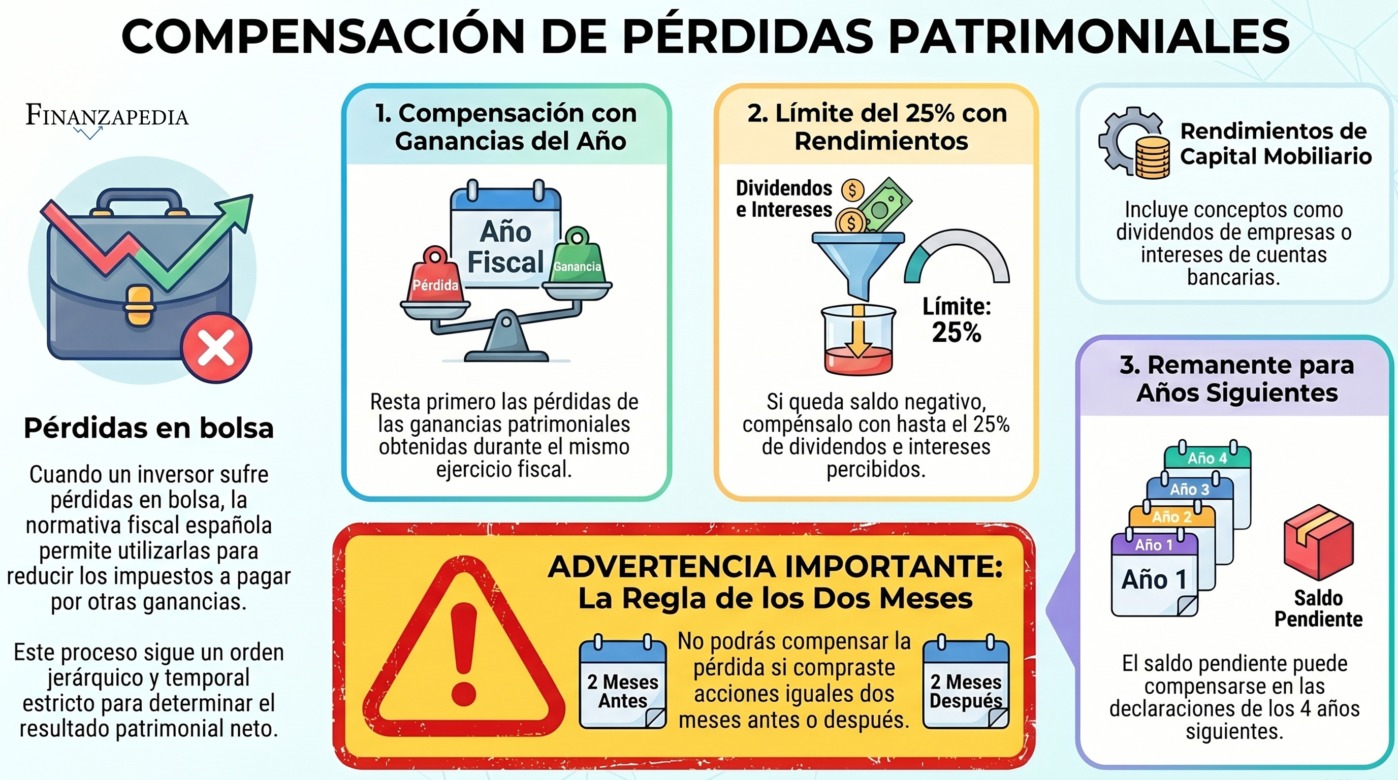 Atención — la regla de los dos meses: Si vendes acciones con pérdidas pero compras acciones de la misma empresa en los dos meses anteriores o posteriores a esa venta, Hacienda no te permite aplicar esa pérdida de forma inmediata. Es una norma diseñada para evitar que se simulen pérdidas artificiales.