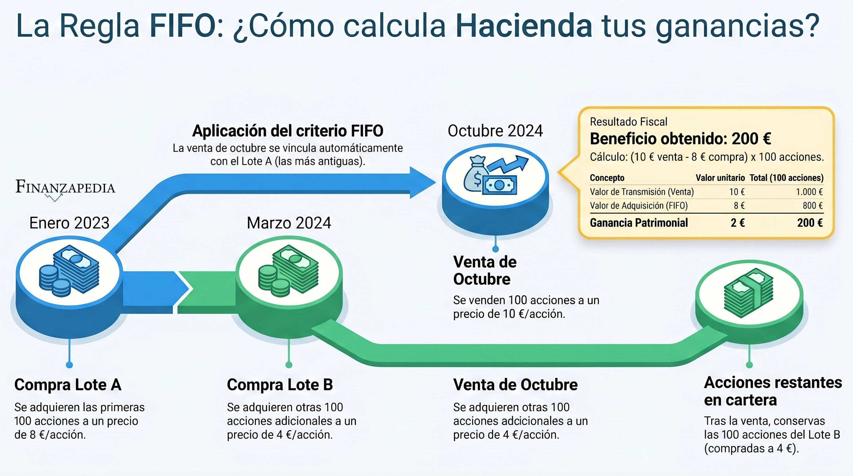 Por la regla FIFO, Hacienda entiende que has vendido las 100 de enero de 2023 (las primeras que compraste). Tu ganancia es: 10 € − 8 € = 2 € por acción → 200 € de ganancia total.